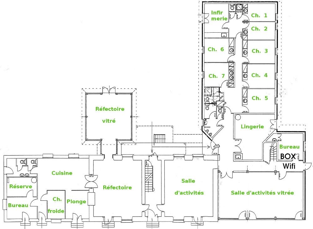 Le gite de groupe est équipé du Wifi en fibre optique. La Box est installée dans la pièce Bureau au rez de chaussée et rayonne sur environ 20 mètres maxi.